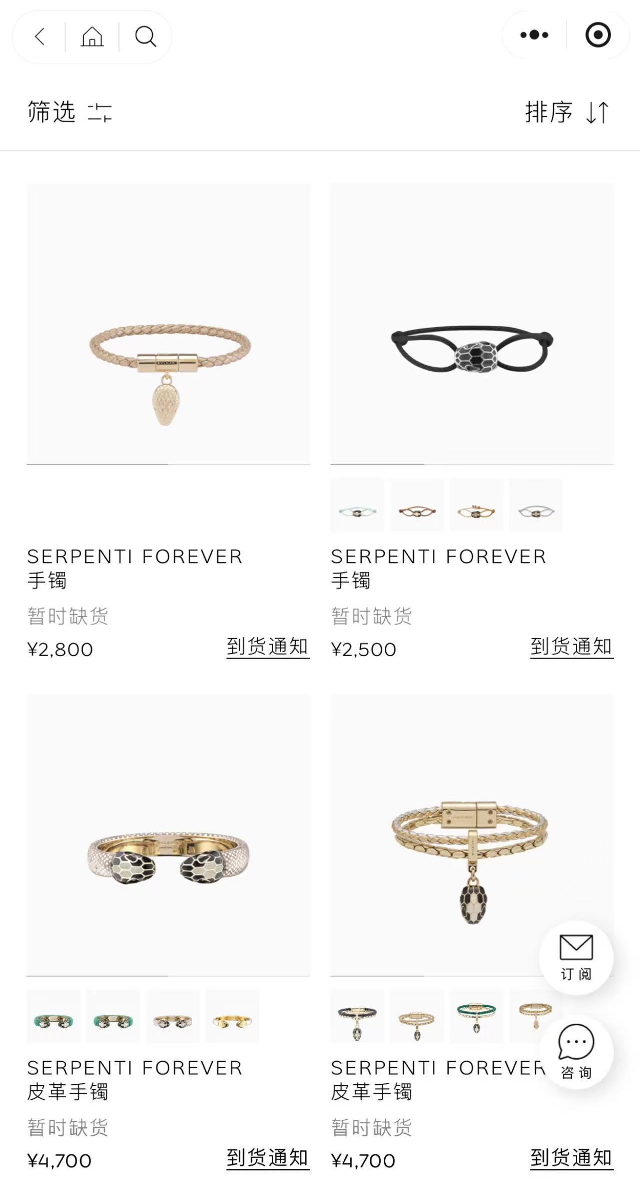 蛇年贺岁饰品是当下扎堆上市的热门款式。据了解,梵克雅宝特别推出用黄K金、孔雀石和缟玛瑙打造的Lucky Animals Snake胸针,需通过预定的方式购买;宝格丽则推出多款Serpenti Forever系列蛇年手绳套装、皮革手镯。后者价格在2500-5000元区间不等,截至记者12月31日发稿时,该系列多款单品均显示“暂时缺货”状态。