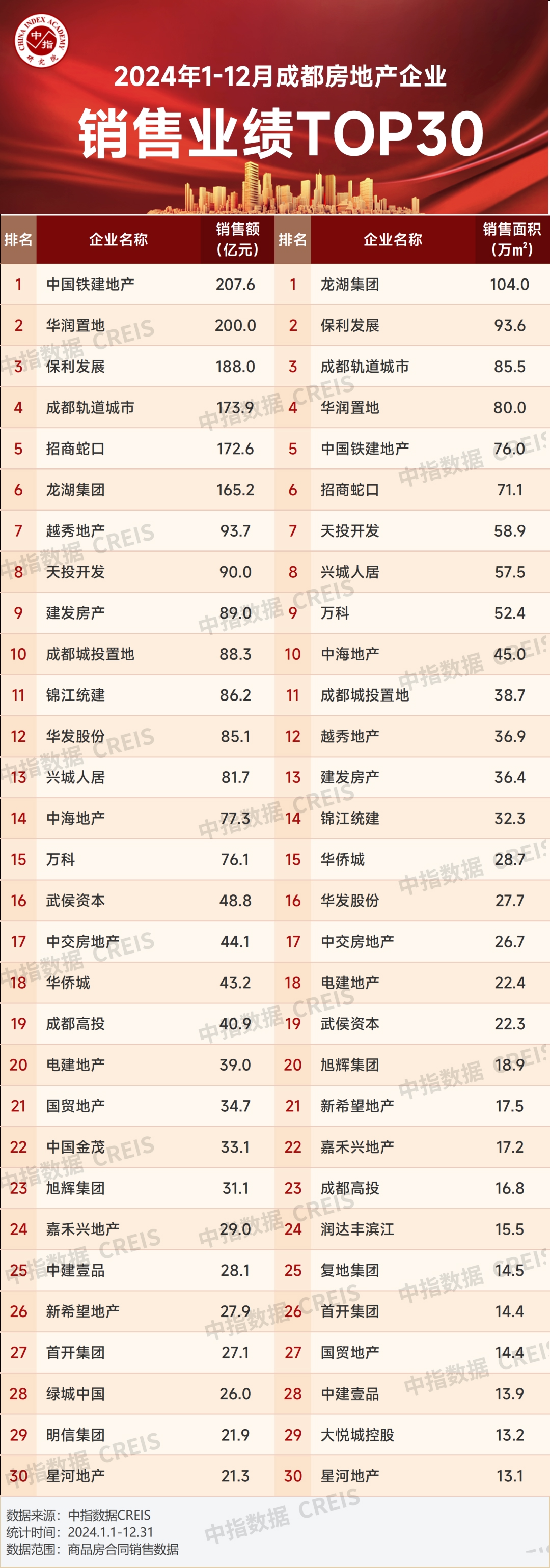 1月2日,中指研究院西南分院发布2024年统计数据,2024年1-12月,销售业绩TOP30的成都房地产企业全年实现销售金额共约2370.8亿元,成交面积约1165.2万㎡。6家房企在蓉销售金额超100亿元,其中,中国铁建地产、华润置地超200亿元,其余4家分别为保利发展、成都轨道城市、招商蛇口和龙湖集团;9家房企销售额超50亿元,分别为越秀地产、天投开发、建发房产、成都城投置地、锦江统建、华发股份、兴城人居、中海地产和万科。排名前十的房企销售业绩共约1468.2亿元,占TOP30总业绩的60%以上,成都市“5+2”区域仍为主要业绩贡献地。