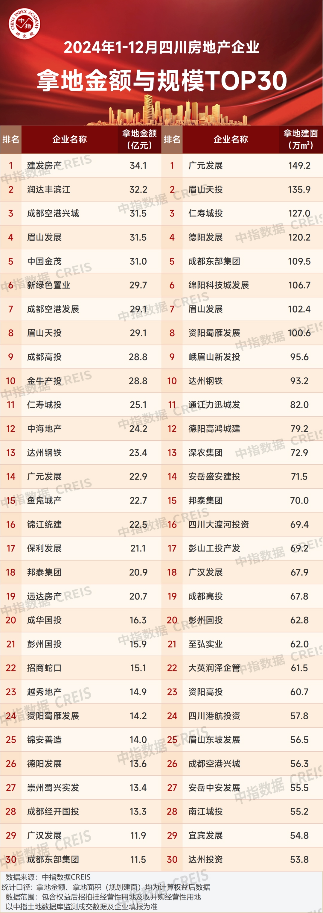 从拿地金额来看,建发房产以34.1亿元位列在川拿地金额TOP1,润达丰滨江以32.2亿元紧随其后,排名第三是成都空港兴城,拿地金额31.5亿元。