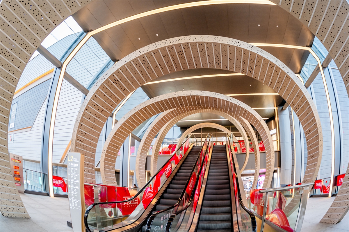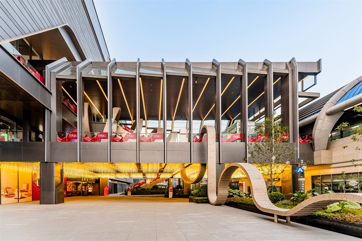 有别于传统“盒子”型商业体,该项目充分考虑“山系”代表的生活方式,提炼山野之间的核心元素,与购物中心的场景和空间相结合,实现商业与自然的时空关联,将“山系”生活融入日常——“挖”出了一个1000平方米的露天中庭,中庭设立垂直错落的光影数字LED屏,以川西山地花园为灵感,将实景空间结合各类川西元素,融入诸多的互动、体验场景,打造成都首个光影峡谷购物公园;在与地铁衔接的L1至L3,金牛招商花园城以“戏水溪流”为概念、提取“水飘带”元素,营造出“瀑布从TOD连廊流入站前广场”的景象,不仅实现了跨层联动、动线引导,而且可供顾客小坐、休憩,兼具艺术性和实用性。