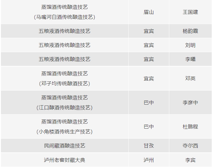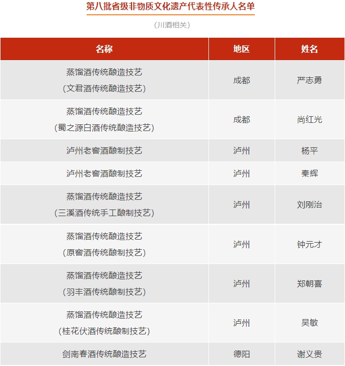 近日,记者从四川省酒业研究和发展中心(以下简称“川酒中心”)获悉,四川省第八批省级非物质文化遗产代表性传承人和传承团体名单正式公布,确定了第八批369名省级非物质文化遗产代表性传承人和5个省级非物质文化遗产代表性传承团体,其中,川酒行业18位传承人分别来自17项传统酿造技艺和1项非遗类民俗活动。