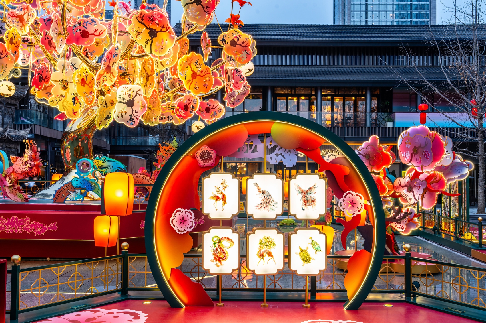 扶桑树接天地,万物生;每逢新春,扶桑花开,瑞兽接踵而至,于神树下欢腾嬉戏,共贺新岁。成都太古里新春艺术装置以象征传统八角戏台的装置为中心,戏台上“生长”出一棵繁盛的扶桑树。艺术家为本次艺术展特别设计六只瑞兽——灵蛇、福象、喜鹿、瑞鹤、锦兔、富甲,围绕着扶桑树,携其各自不同的吉祥寓意为公众带来2025新春的美好祝愿。