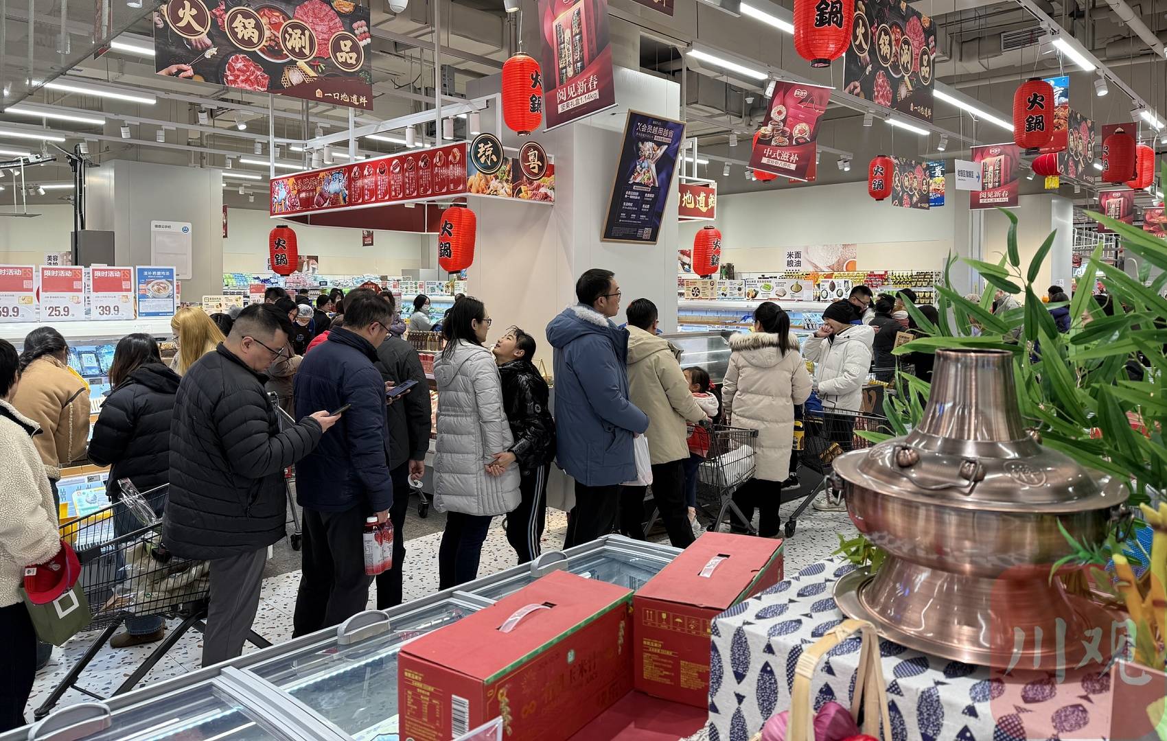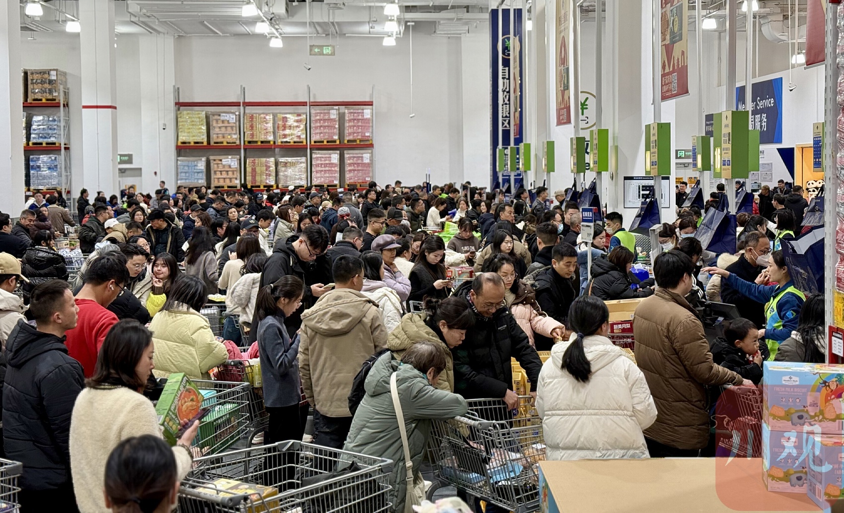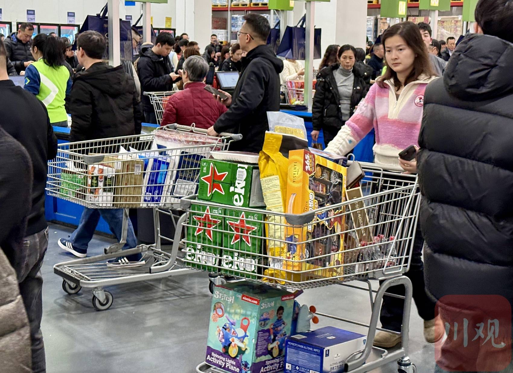 不止山姆,全国多地的盒马、永辉等商超也是人山人海。春节前夕,全国多地“大型商超被挤爆了”的相关词条冲上热搜,1月27日,记者实探成都消费市场,亲眼见证一场场消费盛况。