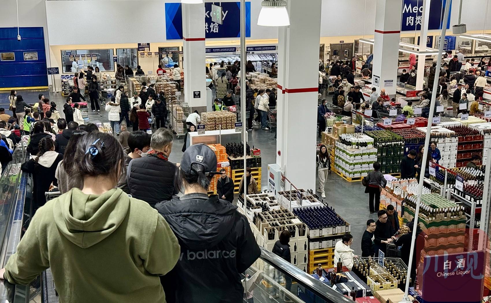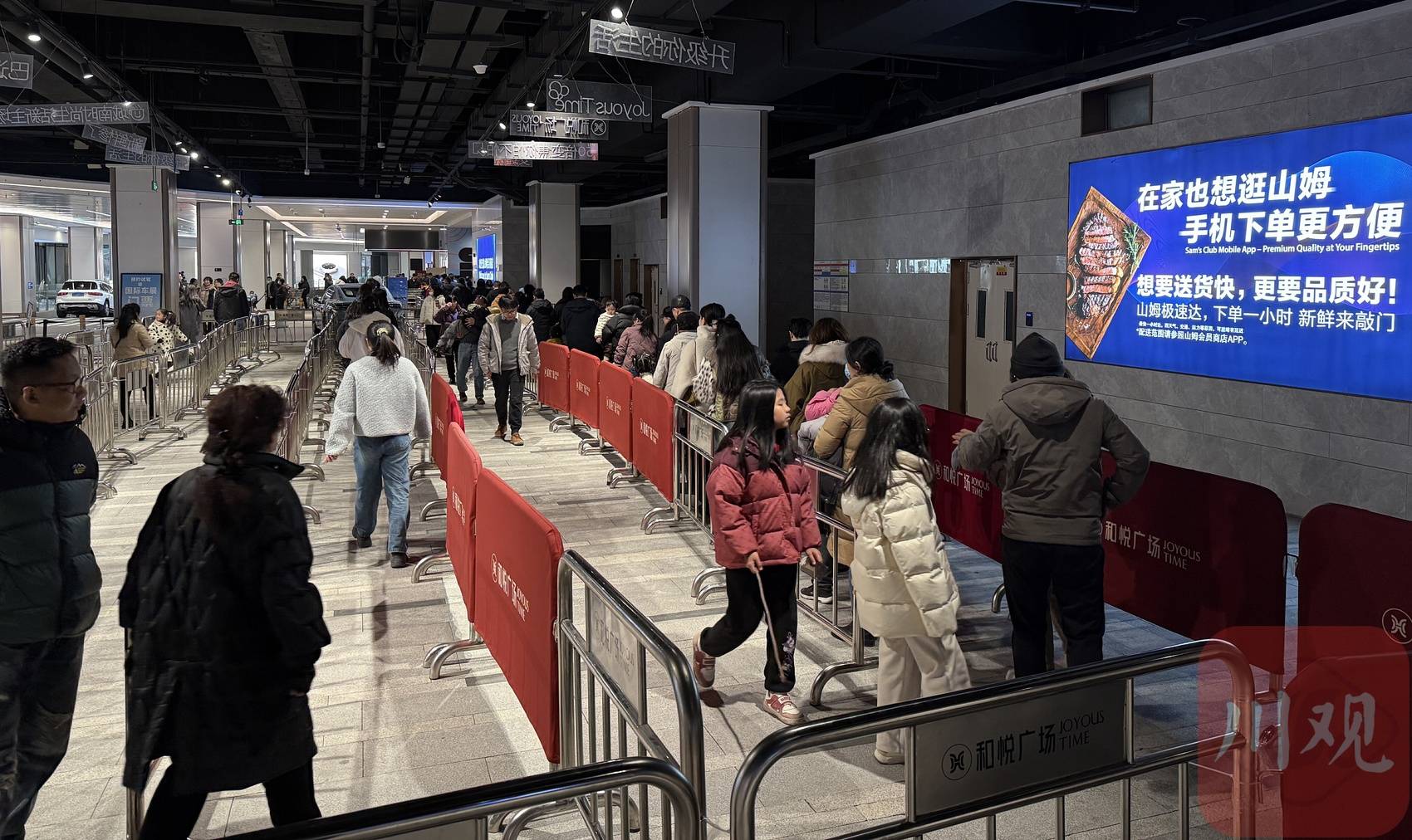在成都,进入“人从众”模式的大型商场远不止一家。1月25日,一位本地消费者早上9点便遇上了涌入山姆武侯店的人潮,“成都人民出门购物是真早。”据该店一位工作人员介绍,当天是临近春节的一个休息日,大多数家庭消费者集体出动采购年货,“我们为限流排队的顾客准备了遮雨棚,同时设置了预计排队时间的温馨提示。”