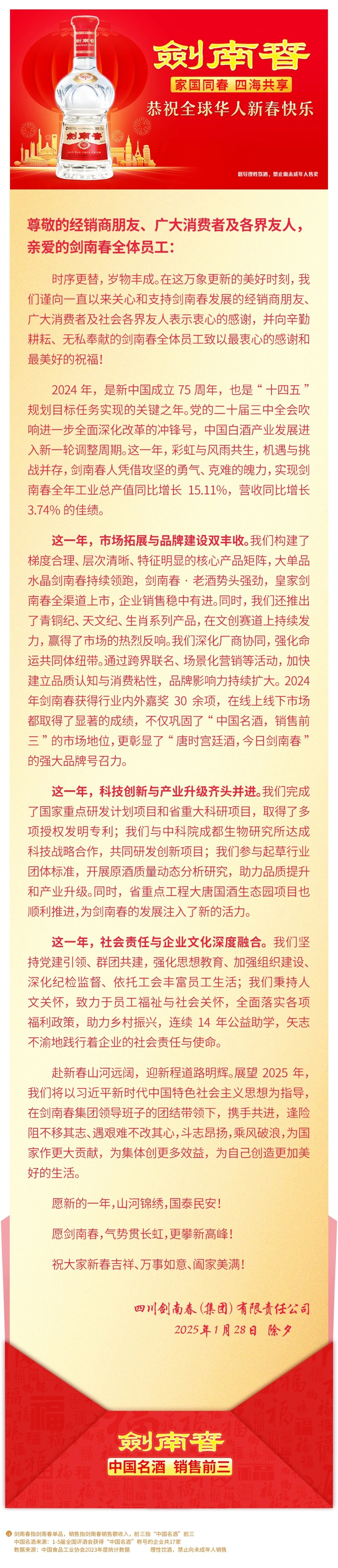 1月28日,剑南春发布新春贺词透露,2024年剑南春实现全年工业总产值同比增长15.11%,营收同比增长3.74%。