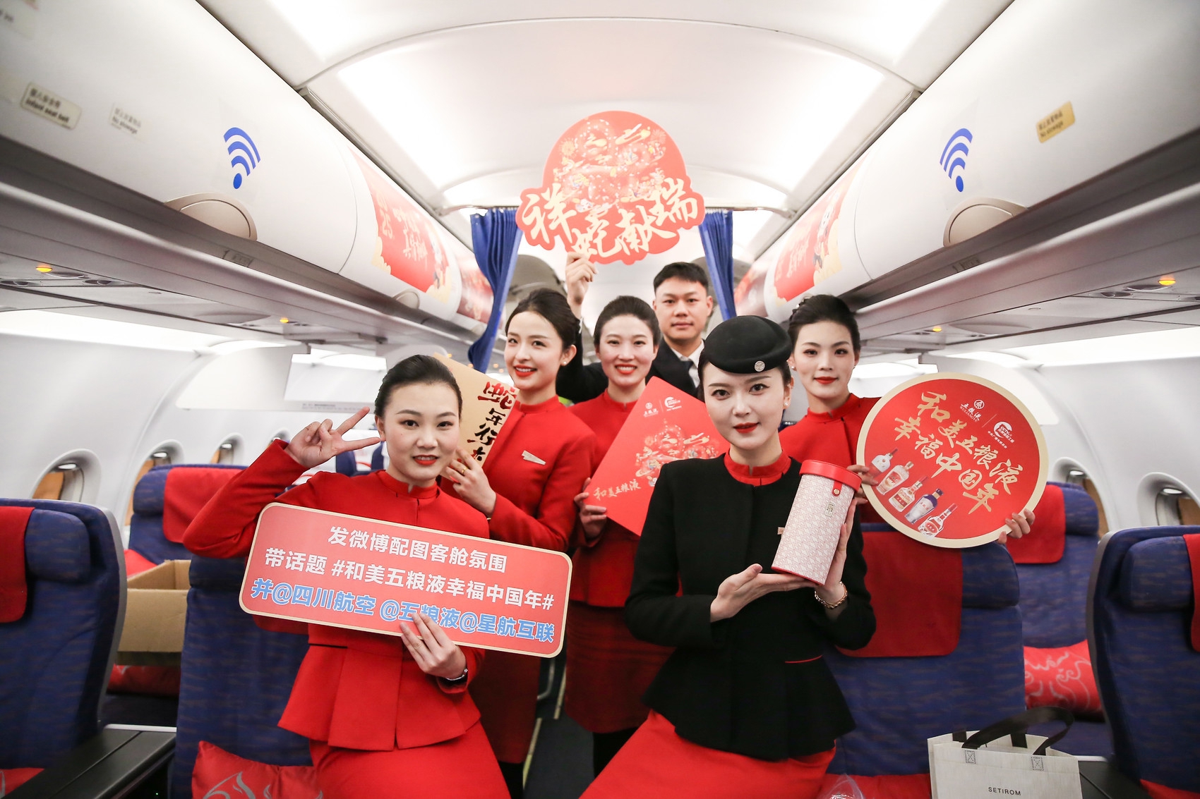 没有抽到春晚大奖的乘客也无需气馁,一场“蛇”我其谁互动活动,让幸运再次降临。在空乘的引导下,乘客们用带“蛇”同音或谐音的成语,给大家送上新春祝福。参与互动并回答正确的乘客可获得五粮液五福筒1个,本次航班共送出10个五福筒。“五粮液福筒是一款以福筒为造型的创意产品,寓意着福气满门、财气满桶,象征着福运满满、财源滚滚。希望能借此款礼品,带给乘客们喜庆和好运。”五粮液公司相关负责人说。
