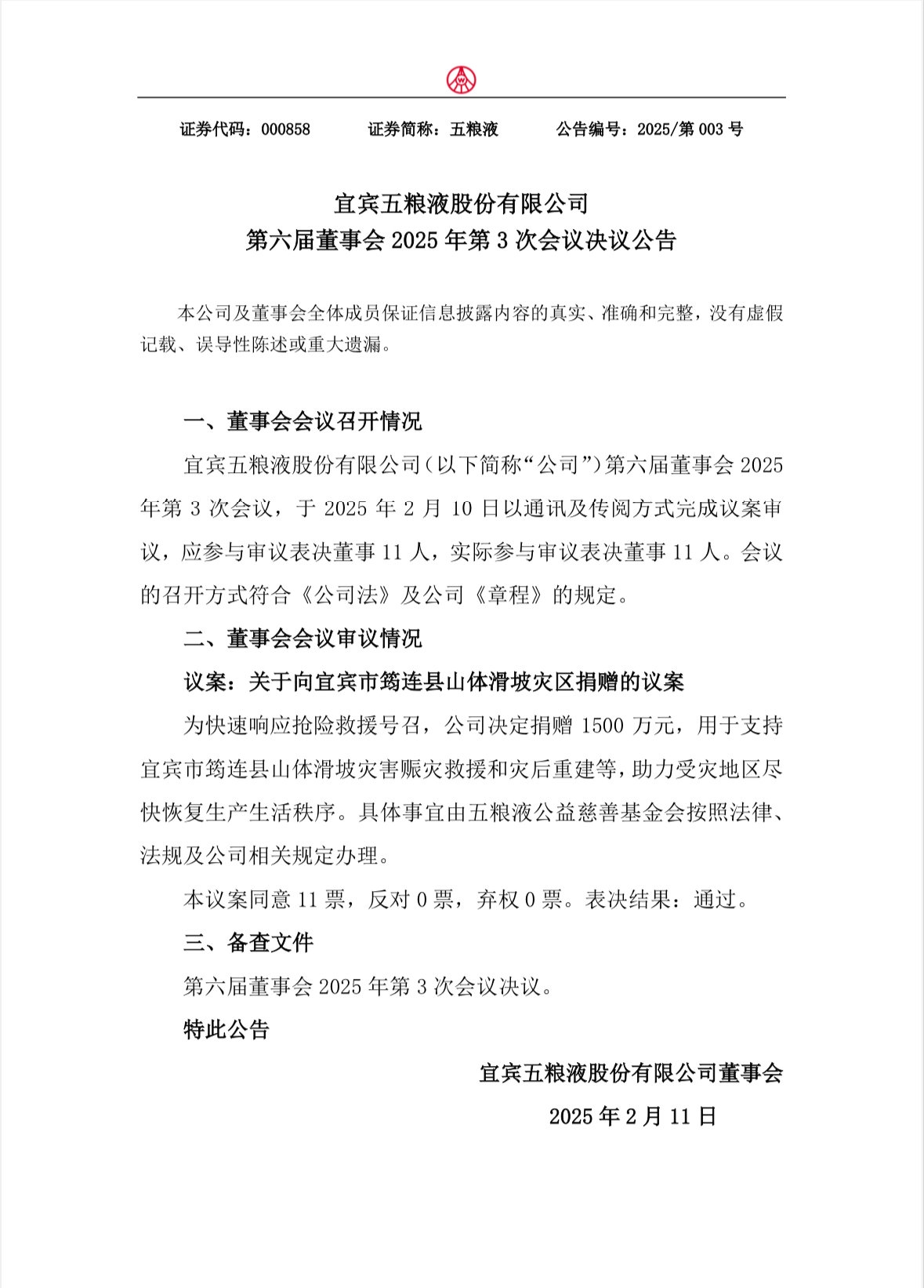 2月10日,宜宾五粮液股份有限公司发布公告称,为快速响应抢险救援号召,该公司决定捐赠1500万元,用于支持宜宾市筠连县山体滑坡灾害赈灾救援和灾后重建等,助力受灾地区尽快恢复生产生活秩序。