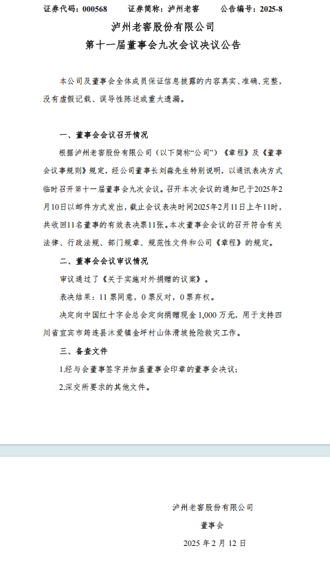 2月11日,泸州老窖股份有限公司发布公告,为快速响应抢险救援号召,决定向中国红十字总会捐赠1000万元,用于支持四川省宜宾市筠连县沐爱镇金坪村山体滑坡抢险救灾工作。