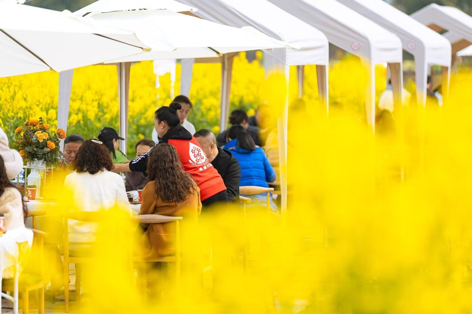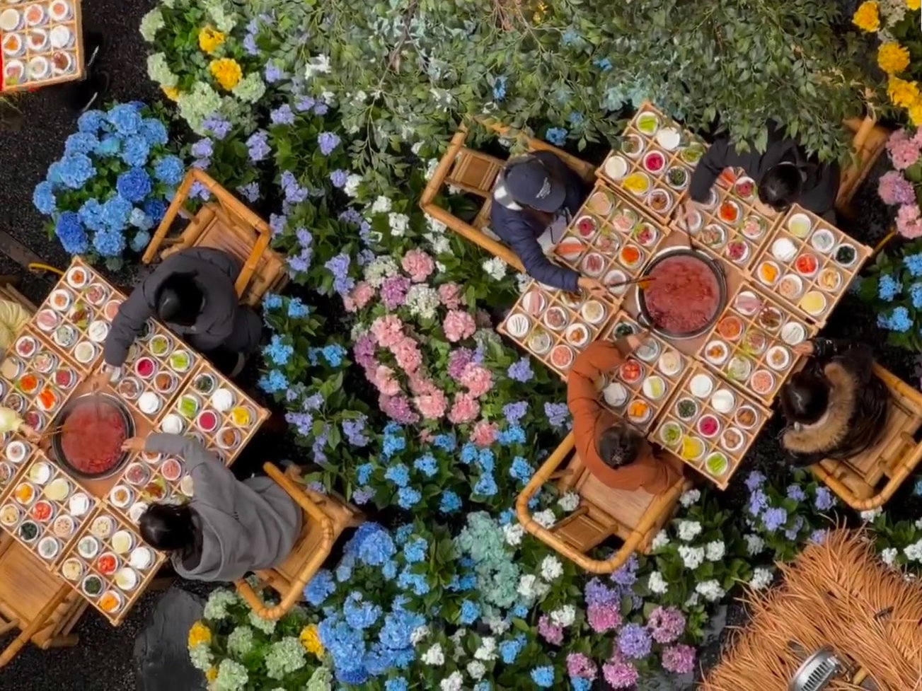 2月26日,蜀九香花田快闪店在崇州“开伙”。伴随着鲜花的芬芳和沸腾的气息,游客们纷纷寻香而来,场面十分热闹。而在20多公里外的天府农业博览园内,另一处花田火锅同样人气爆棚,出现“一桌难求”的现象。
