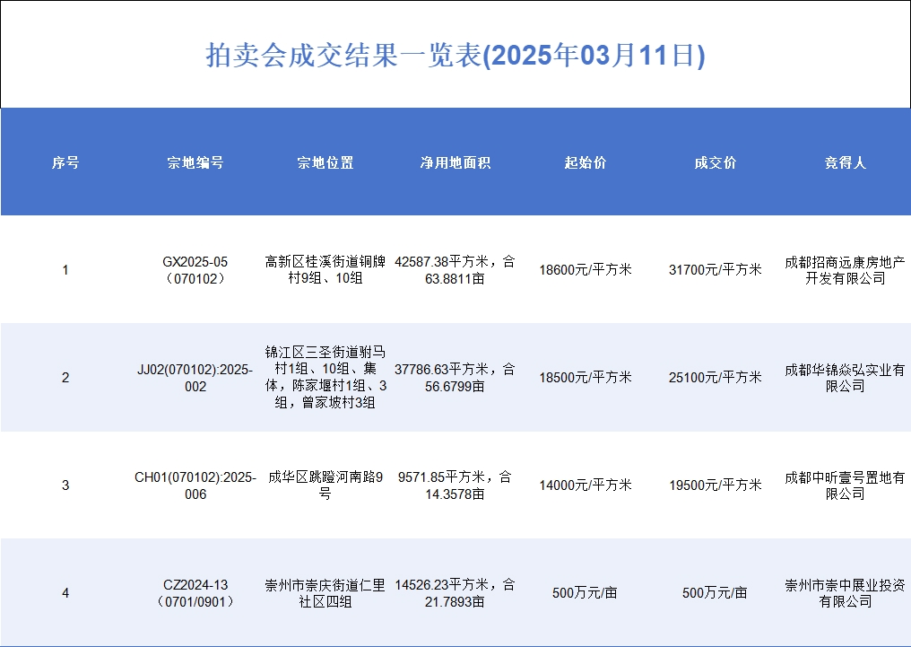 今日,成都市主城区拍卖3宗地,分别位于高新南区、锦江区、成华区,均具有优越的地理位置,吸引了包括招商、建发、华润、越秀、金茂等在内的多家房企参与竞拍。截至记者发稿,3宗地块均顺利成交,其中,锦江区三圣街道56.68亩地块,成交楼面价25100元/㎡,由成都华锦焱弘实业有限公司(华发、锦江统建)竞得;成华区跳蹬河南路14.35亩地块,成交楼面价19500元/㎡,由成都中昕壹号置地有限公司竞得。此外,一宗位于崇州市的21.7亩地块,以500万元/亩成交。