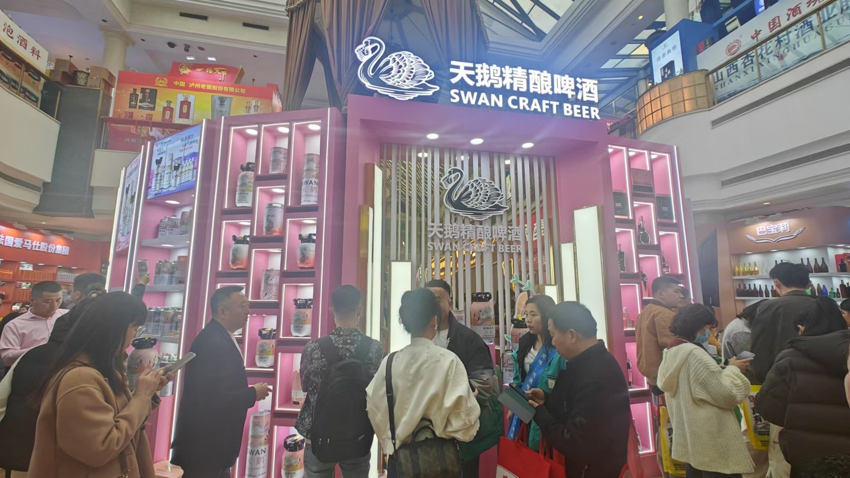 东圣酒业展台附近,来自青岛的天鹅精酿啤酒展台周围挤满前来咨询的客商。