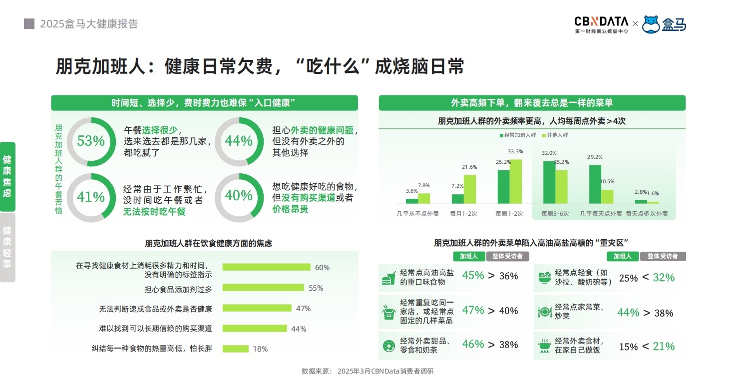 在这一街区中,外卖小哥也在夜空下四处穿梭,在不同的写字楼间送餐。“忙碌的都市年轻人每周点外卖的频率高达4次以上,且45%的加班人偏爱高油高盐的食物。”盒马近期联合第一财经商业数据中心(CBNData)发布的《健康无需“负重前行”:当代都市“碌”人的轻健康觉醒》洞察报告(以下简称《报告》)披露了这样一组数据。