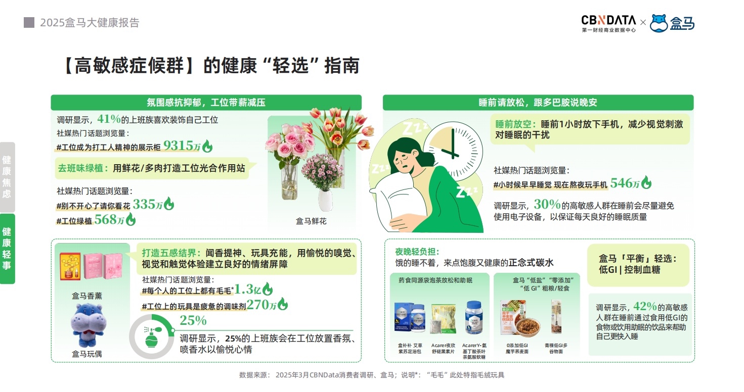 从“放‘青’松”、“禁止‘蕉’虑”等去班味绿植,到解乏型治愈型香薰,当代都市“碌”人用视觉、嗅觉、触觉构建“情绪缓冲带”;再到舌尖上的“轻健康”,各种适配“成分洁癖”的健康食谱不仅对均衡饮食方式进行科普,也在为城市居民提供可靠的健康生活指南。