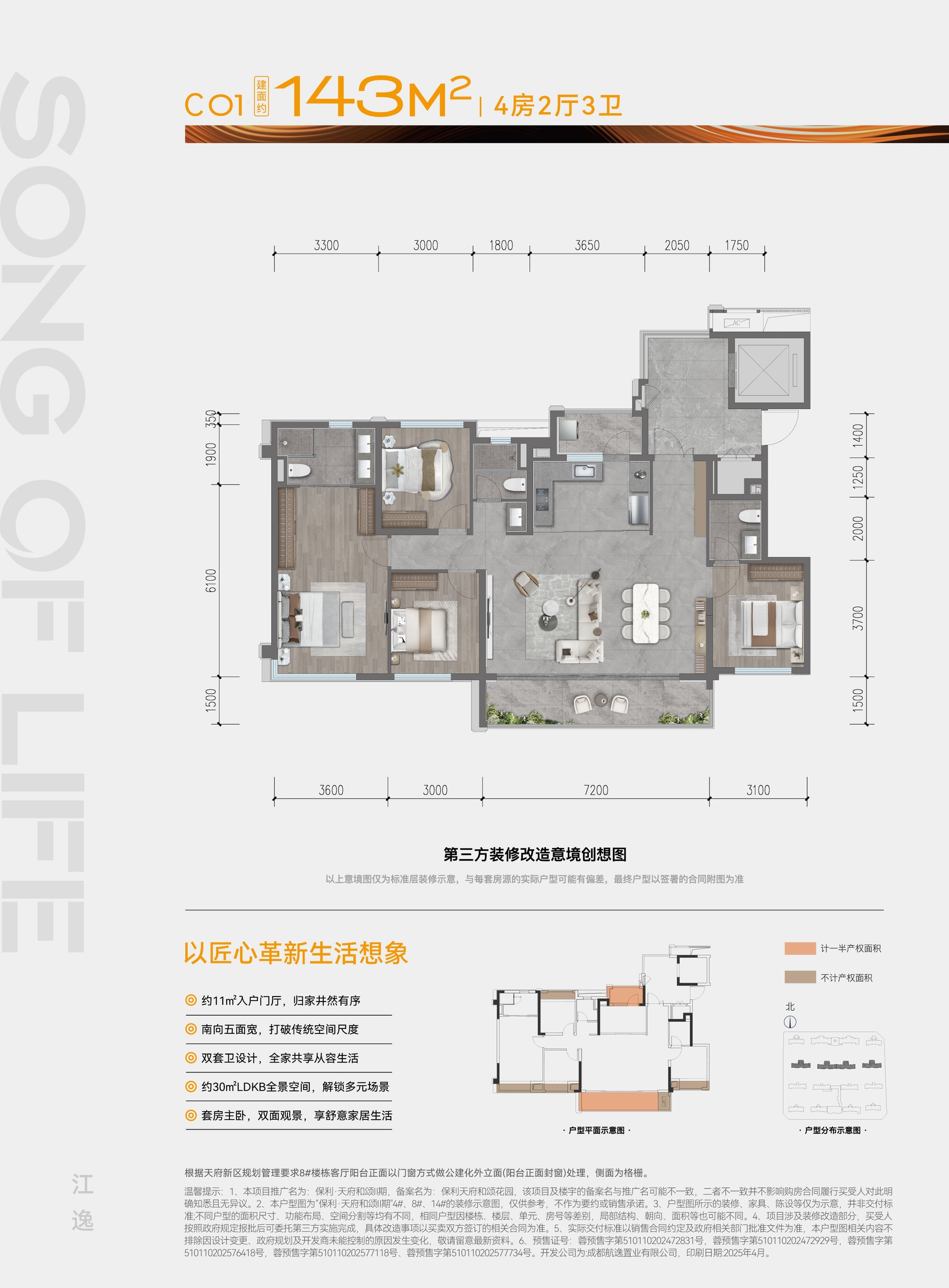 保利·天府和颂二期在售的主力户型为143平方米四房。该户型有约11平方米的独立入户门厅,提升了居住的私密性和舒适度;北向和南向“五面宽”的设计,使得整个户型采光充足,通风良好,打破了传统空间尺度,使居住更加舒适;约7.2米开间的阔尺横厅,连接宽幕阳台,尽享中庭景观;双套卫设计提高了生活效率。约30平方米的全景空间(客厅、餐厅、厨房、阳台),解锁多元场景用途,既增大家庭活动的共享空间,又提升户型的功能性和灵活性。主卧套房配有独立的浴室和观景窗,不仅提供了高品质的居住体验,还能享受惬意的家居生活。