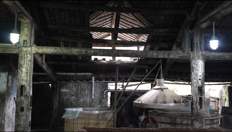 在高庙古镇酒业有限公司花溪源酒窖池内,目之所及皆是木桶、木甄、木箱……蒸气弥漫中,一名从业10多年的酿酒工人,将蒸好的粮食均匀平铺在木箱内,以待粮食内的淀粉糖化。