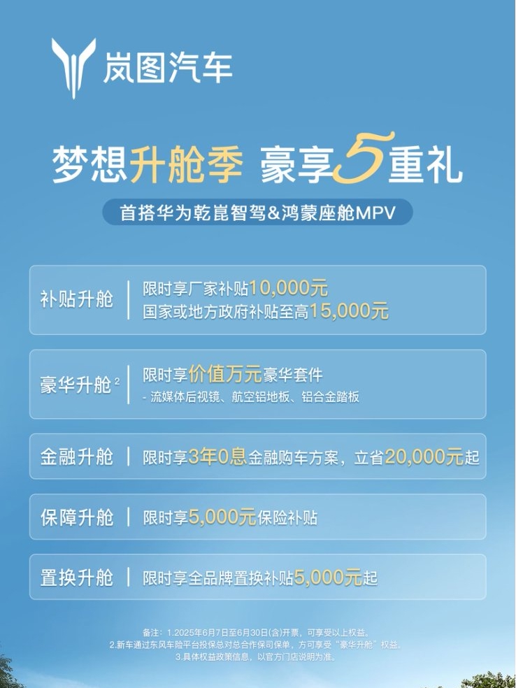 随着销量持续攀升,岚图梦想家在新能源MPV领域的影响力还在持续深化。目前,购车优惠仍在进行,6月7日—30日下定交付,立省5.5万元起,还可享受万元豪华套件免费升级,为消费者带来超值选择。