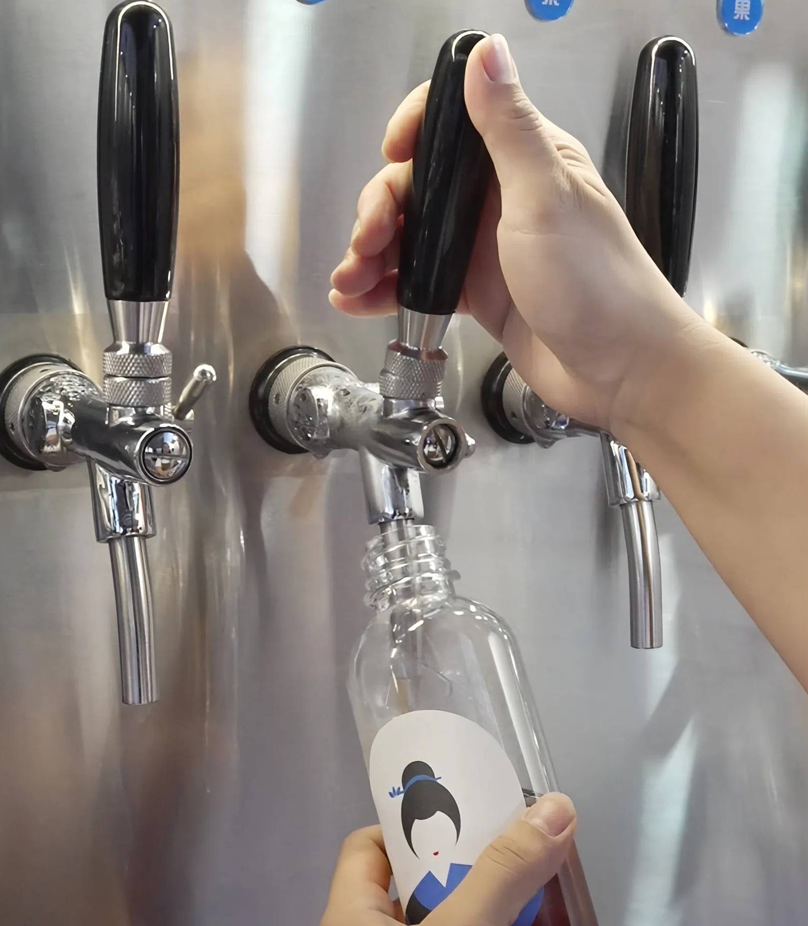 记者在店里看到,40余款酒品覆盖果酒、米酒、白酒、啤酒等,单价从几元到几十元不等,一两起售,一公里内免费配送,冷链鲜酿保证口感。此外,木兰打酒为堂食客人提供精美酒具酒杯,为外带消费者提供玻璃瓶、塑料瓶,分为50毫升、500毫升不同规格。