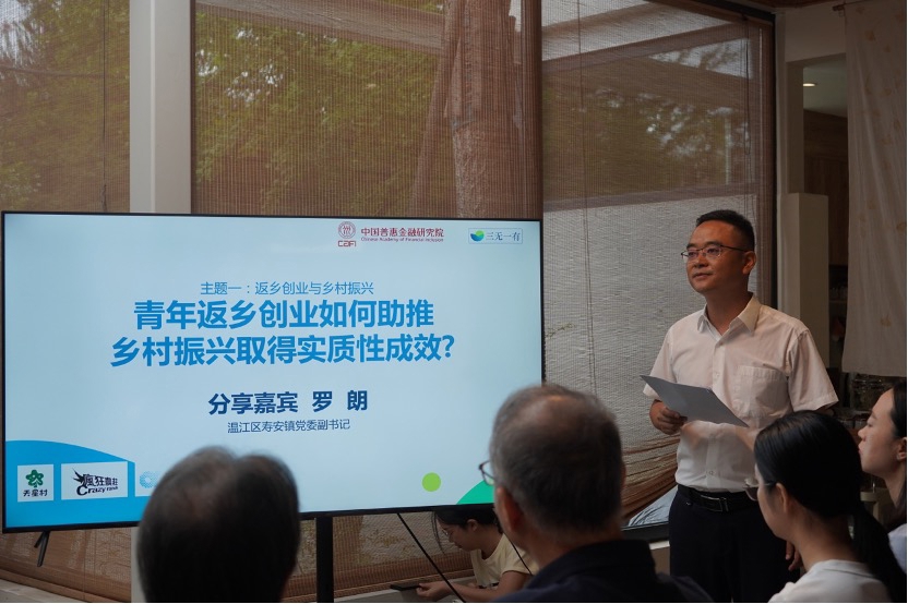 在“三无一有”项目工作方案推广与发布环节,项目带头人、CAFI研究员韩飞博士回顾了自去年12月以来在崇州市江源街道推动“三无一有”试点的合作情况及进展,并提出下一步将依托专家顾问和崇州本地金融资源,重点支持人才返乡与创业青年的金融能力的提升,推动生态农业和青年发展类项目实施,强调项目的可复制性与拓展性,积极拓展多元融资渠道。他还建议从普惠金融、绿色金融、供应链金融和科创人才金融等多维度切入,配合江源全域可持续发展规划,撬动更多长期金融资源参与地方建设。