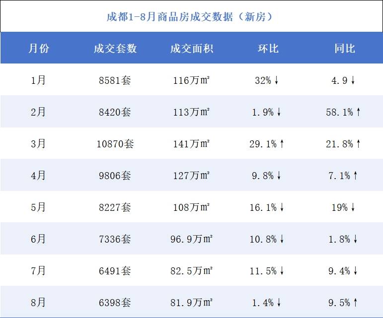 不过,与去年同期相比,成都楼市的成交套数和成交面积仍有小幅上涨。今年1-8月,全市共成交66129套房,同比上升4.86%;成交面积866万㎡,同比上升4.47%。
