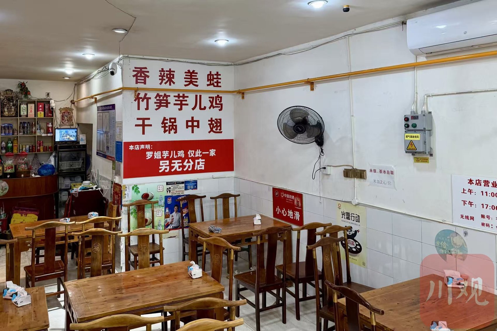 罗姐竹笋芋儿鸡店内标注无分店声明。赵泽宇 摄