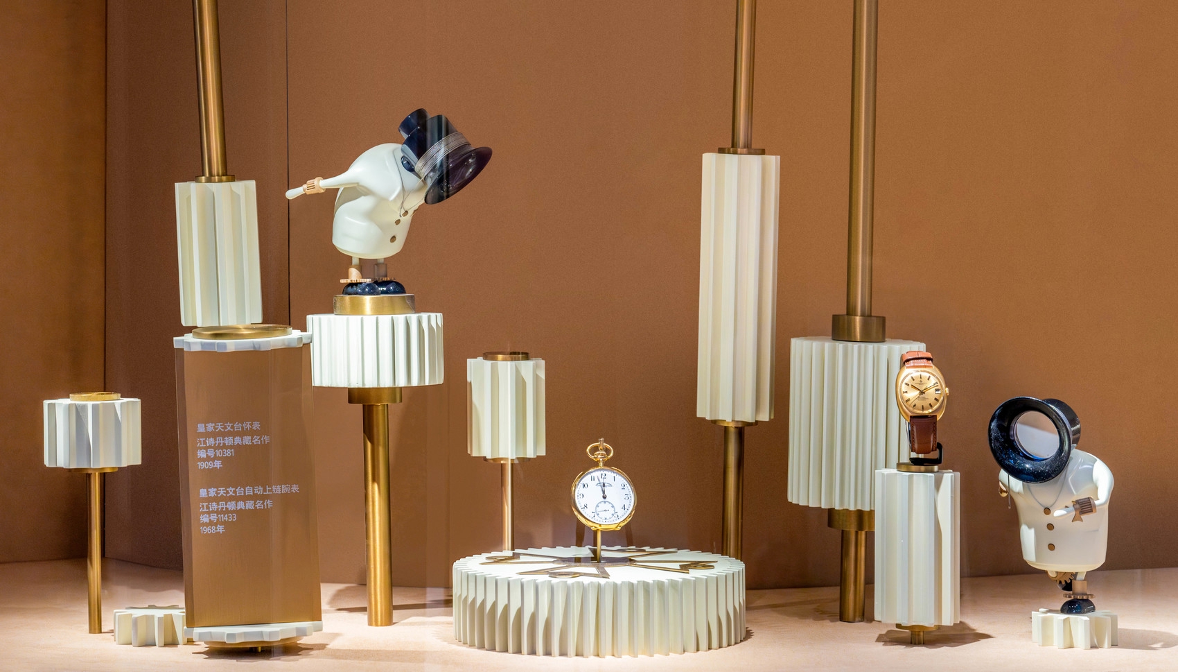 “臻途”限时体验空间内“传奇源起”展区的时计展柜。图据受访者