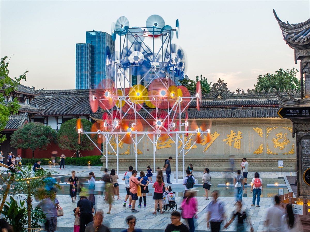 在漫广场,10米高的“大风车”正在水景之上旋转。这是由成都太古里特邀英国艺术家组合伊莎贝尔+海伦,从成都太古里的保留古建“字库塔”的六边形结构中汲取灵感创作的艺术装置“乘风”。现场,大慈寺红墙边飘来金桂花香,伴着灵动的音乐,市民和游客在此小憩。不少观者表示:“成都的松弛感在这一刻被具象化。”