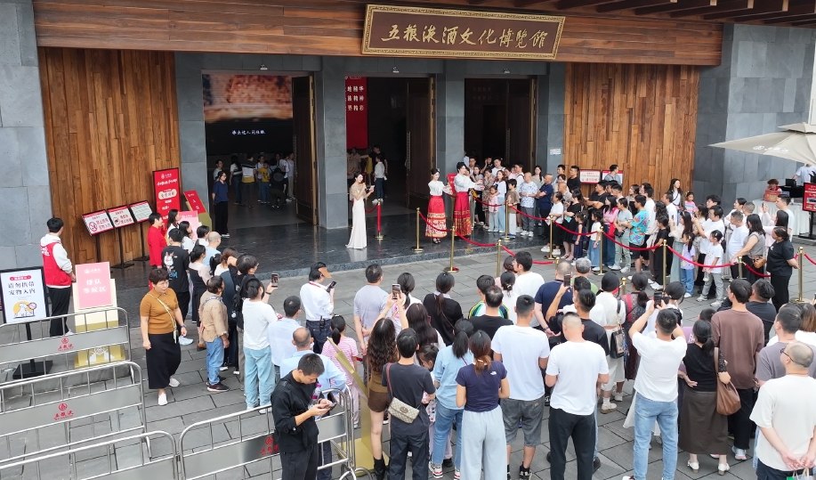 在五粮液酒文化博览馆内,五粮液系列产品的国风走秀成为全场焦点。展馆内定时免费讲解场场爆满,讲解员带领游客追溯酒史,领略中国白酒深厚底蕴。