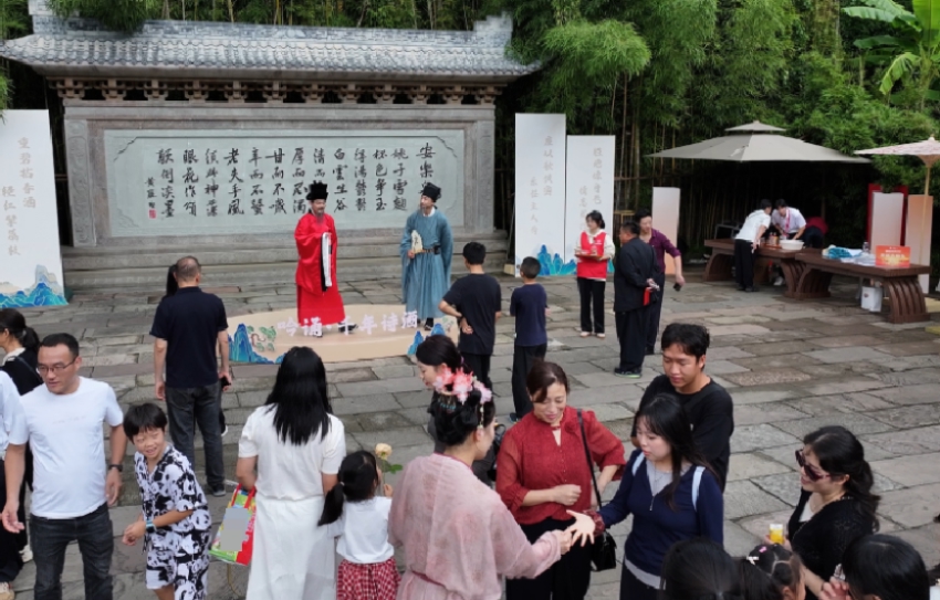 在安乐泉景点,五粮液打造诗酒游园活动,景区NPC与游客互动,一起探秘酒香。活动现场,五粮液咖啡、五粮液特调鸡尾酒带来全新酒饮体验,吸引众多消费者尝新。
