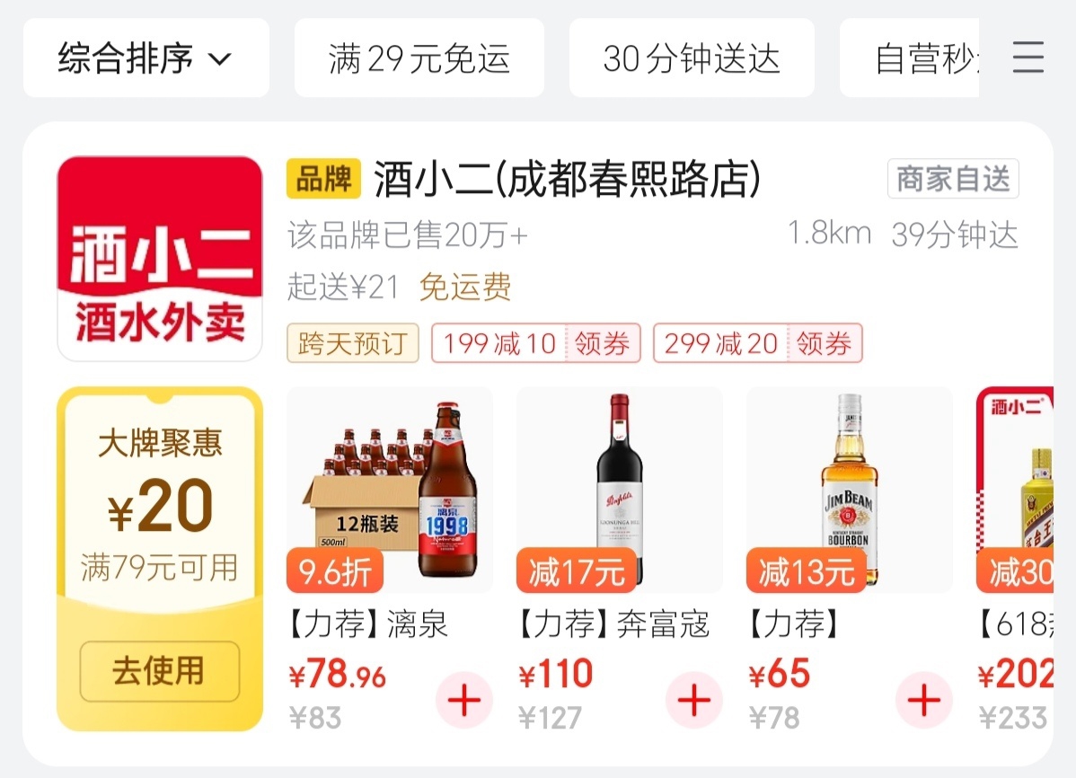从名酒行、闪购到布局线下,电商大平台不断延伸在酒类消费的触角。以歪马酒库为例,该店酒类产品红酒、啤酒以及各种烈酒应有尽有,还兼具“打酒铺”功能,提供20多款来自川酒集团的散酒以及定制产品,还有散卖啤酒。“供应链强大、擅长本地生活、拥有超大流量池,比传统的酒类连锁更具优势,实力远胜个体化的名烟名酒店。”有业内人士这样分析。