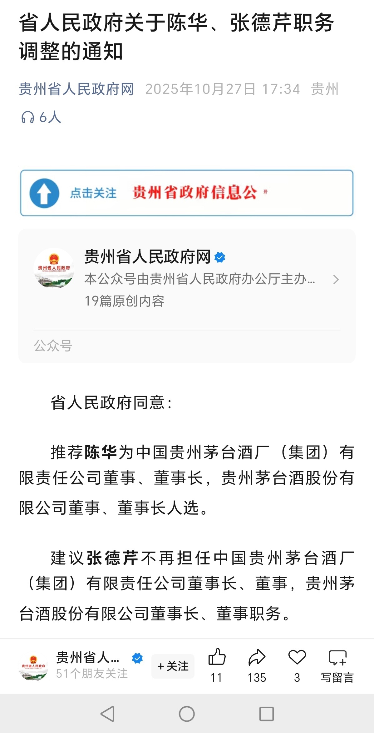 10月27日下午,贵州省人民政府官网发布关于陈华、张德芹职务调整的通知。贵州省人民政府同意:推荐陈华为中国贵州茅台酒厂(集团)有限责任公司董事、董事长,贵州茅台酒股份有限公司董事、董事长人选。建议张德芹不再担任中国贵州茅台酒厂(集团)有限责任公司董事长、董事,贵州茅台酒股份有限公司董事长、董事职务。