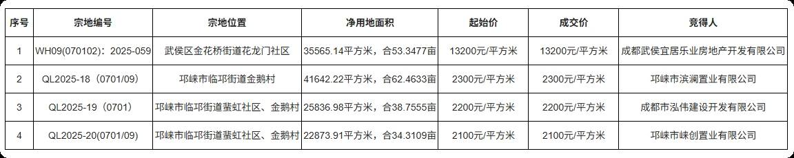 当天出让的成都主城区另一宗地位于武侯区金花桥街道花龙门社区,净用地面积为53.3477亩,由成都武侯宜居乐业房地产开发有限公司以13200元/㎡的底价竞得。另外三宗地块均位于邛崃市临邛街道,具体成交情况如下: