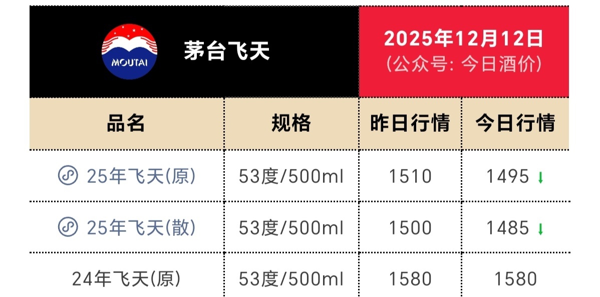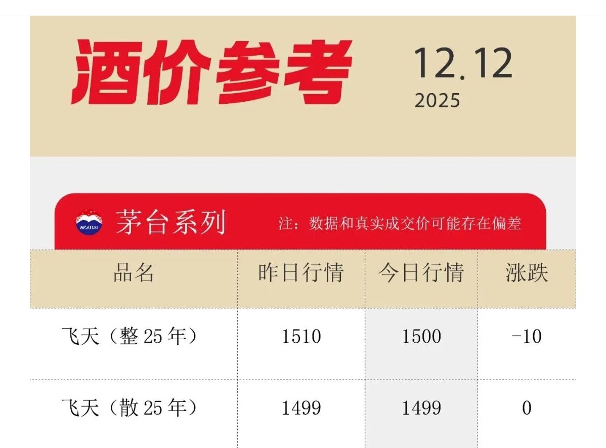 12月12日,多个酒类行情平台数据显示,飞天茅台批发价格已跌破1499元/瓶的官方指导价。其中2025年散瓶飞天茅台报价已低至1479元,2025年原箱价格也回落至1490元左右,均低于1499元。