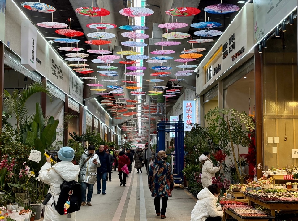 三圣花市里,数百把彩色油纸伞将顶棚装点得颇为喜庆,市民穿梭于花店之间,为春节的仪式感做准备。据市场管理方透露,2025年成都市年宵花会期间,这里的日均客流量超2万人次。