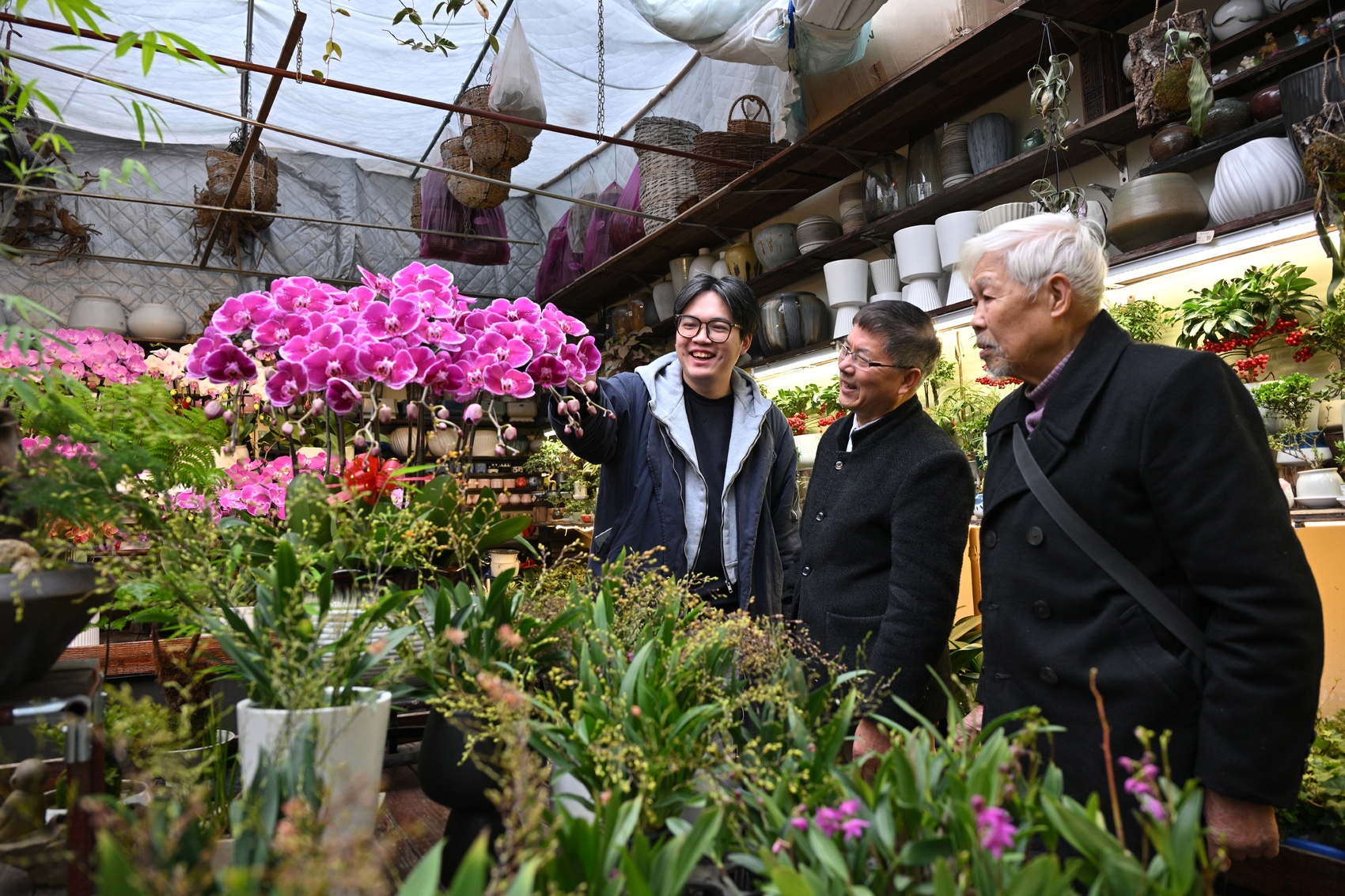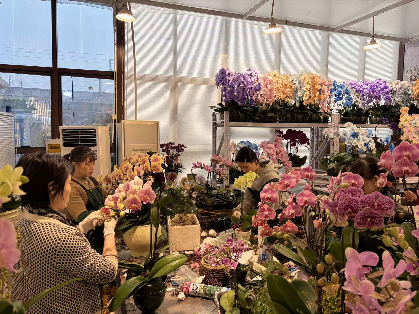 在蝴蝶兰专区,空气中弥漫着淡淡幽香,几位店员忙着对花株进行修剪和组盆。