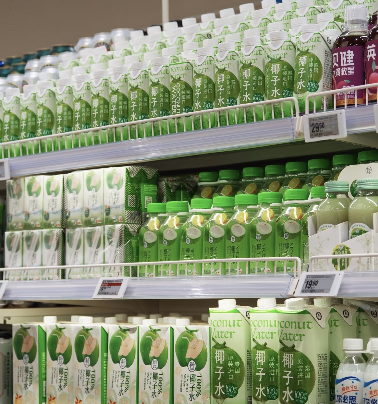 4月3日,成都某大型商超的饮料货架上,椰子水品牌一字排开,包装上“100%椰子水”“NFC非浓缩还原”等字样格外醒目。就在几天前落幕的第114届全国糖酒商品交易会上,椰子水同样是热门单品——泰新鲜、椰牛、轻上、菲诺等品牌悉数登场,甚至有厂商推出椰子啤酒、椰子咖啡等跨界新品。