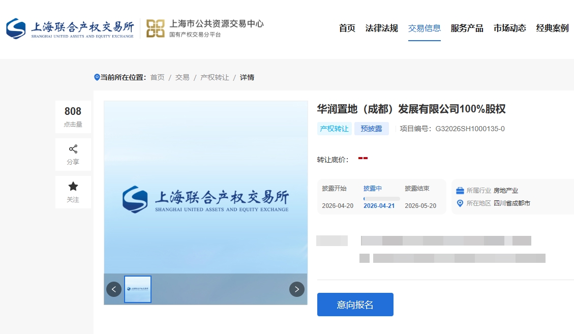 四川在线记者4月21日从上海联合产权交易所获悉,华润置地有限公司旗下全资子公司超智资源有限公司于4月20日起预披露,转让其所持有的华润置地(成都)发展有限公司100%股权。华润置地(成都)发展有限公司正是成都万象城的实际主体公司。此次股权转让事宜已于今年4月初获得华润置地有限公司批准。