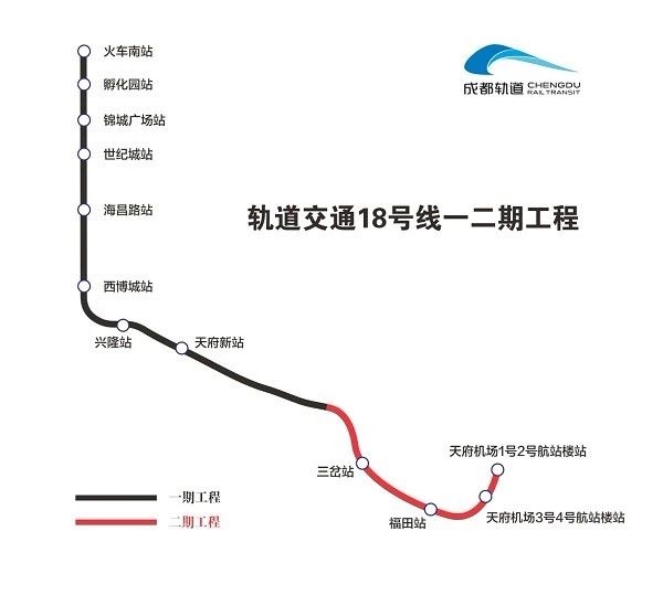 目前,18号线一二期全线车站封顶,高架桥通,盾构洞通,合江车辆段已整体移交成都地铁运营公司。