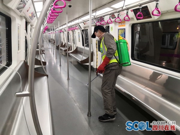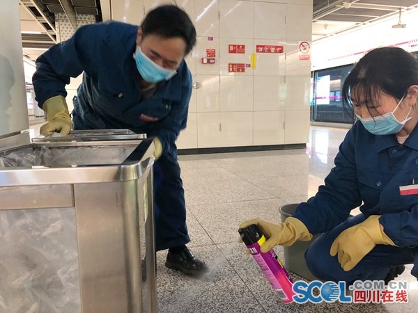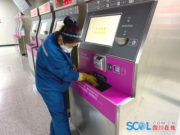 成都地铁在车站原有清洁消毒基础上,增加站内消毒频次,确保地铁站内电扶梯扶手、自动售票机、座椅、闸机等区域及设备设施的清扫与消毒每日不少于4次,此外针对客流较大的重点车站,每2小时进行一次清扫与消毒,并确保安检机每日清扫消毒不少于5次。