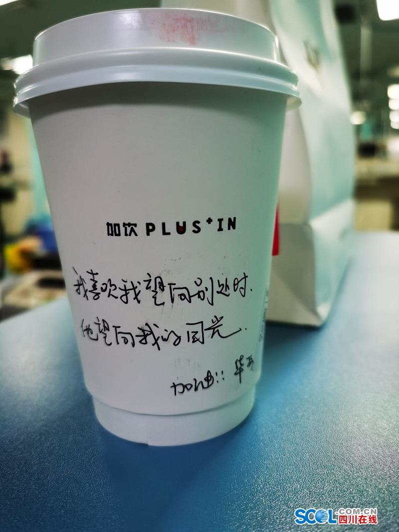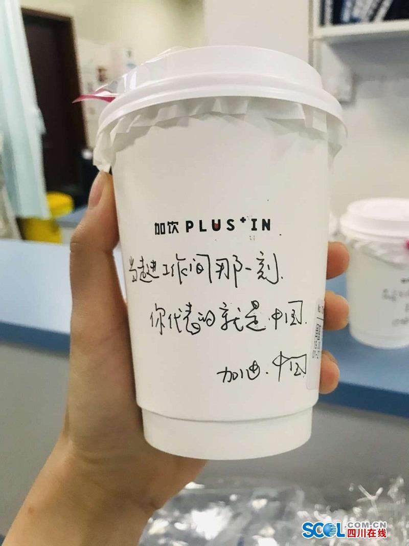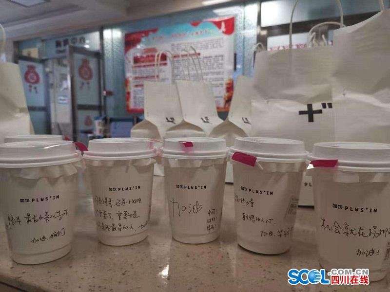 四川在线消息(记者 杨丹)今天下午,华西医院急诊科收到匿名市民送来的外卖,50杯热腾腾的咖啡。更为特别的是,每一个咖啡杯上,都手写了不同的鼓励和祝福的语句,“当走进工作间那一刻,你代表的就是中国”,“累了,就歇一歇,也很重要”。