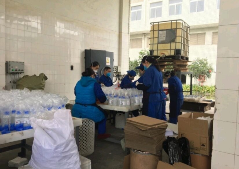 同样地处天府新区新能源新材料产业功能区的灵敏洗涤用品公司,主要生产经营性洗涤用品。面对新型冠状病毒肺炎防疫防控形势,公司积极筹划转产为消毒用品的生产,把经营性洗涤用品生产线全部调整为消毒用品生产线,原料、生产、化验、质检、物流、后勤等部门通力协作,全力保障市场供应。