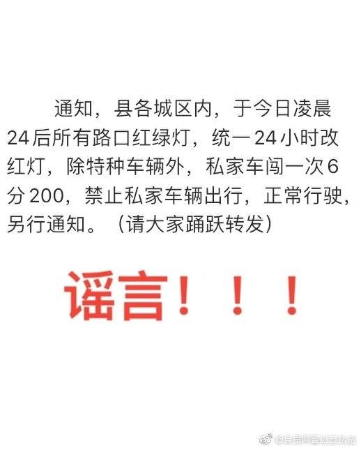 四川在线消息:1月30日自贡网警巡查执法官方辟谣,近日,许多市民的朋友圈、微信群出现这样一则消息——通知,县各城区内,于今日凌晨24后所有路口红绿灯,统一24小时改红灯,除特种车辆外,私家车闯一次6分200,禁止私家车辆出行,正常行驶,另行通知。