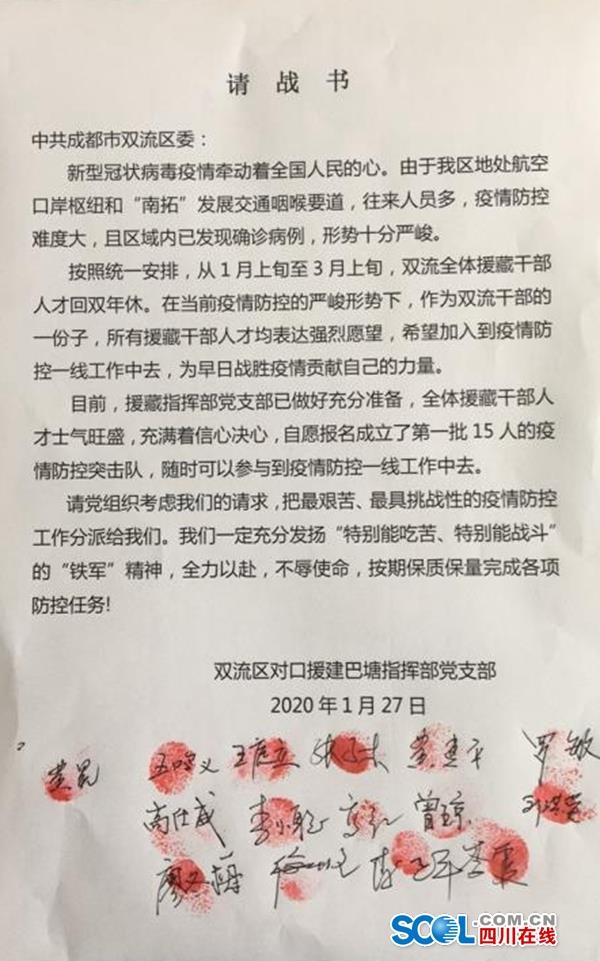 按照统一安排,从1月上旬至3月上旬,双流全体援藏干部人才回双年休。在当前疫情防控的形势严峻,全区干部积极参与防控的情况下,援藏干部人才纷纷表达强烈愿望,要求放弃休假,请战到一线加入疫情防控工作,为早日战胜疫情贡献自己的力量。
