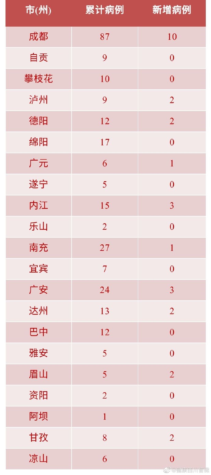 新增确诊病例中,成都市10例、内江市3例、广安市3例、泸州市2例、德阳市2例、达州市2例、眉山市2例、甘孜州2例、广元市1例、南充市1例。