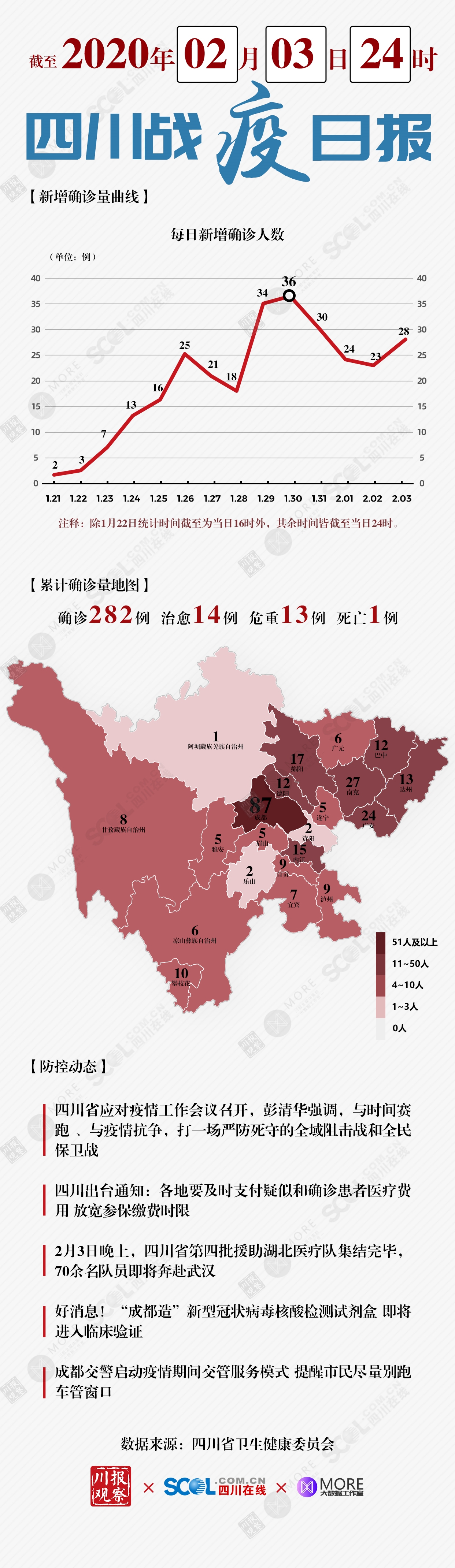 截至2月3日24时,我省累计报告新型冠状病毒感染肺炎确诊病例282例,涉及21个市(州)。其中成都市87例、南充市27例、广安市24例、绵阳市17例、内江市15例、达州市13例、德阳市12例、巴中市12例、攀枝花市10例、自贡市9例、泸州市9例、甘孜州8例、宜宾市7例、广元市6例、凉山州6例、遂宁市5例、雅安市5例、眉山市5例、乐山市2例、资阳市2例、阿坝州1例。