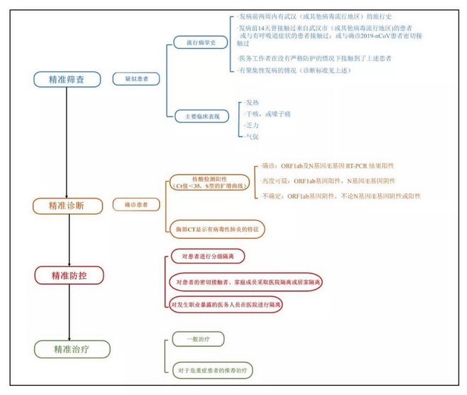 文章提出了针对2019新型冠状病毒(2019-nCoV)感染肺炎的精准医疗模式(图1),这一模式主要涉及疾病的筛查、诊断、防控和治疗4个方面。该研究根据国家卫生健康委《新型冠状病毒感染的肺炎诊疗方案(试行第四版)》、世界卫生组织《疑似新型冠状病毒感染造成严重急性呼吸道感染的临床处置指南》以及四川大学华西医院临床一线的诊治经验,通过组建一支由四川大学华西医院呼吸与危重症医学科、感染科、急诊科、重症医学科、放射科、实验医学科构成的多学科联合会诊团队,建立了一种2019新型冠状病毒肺炎的精准医疗模式。这一精准医疗模式提出医疗机构等相关单位首先通过询问患者流行病学史、是否出现呼吸道症状等,筛查出疑似2019-nCoV病毒感染患者,结合核酸检测及胸部CT,对疑似患者进行联合多学科的精准诊断,对感染患者、密切接触者、家庭成员、医务人员采取不同的隔离措施,并根据感染患者的不同临床情况进行个性化的精准治疗。