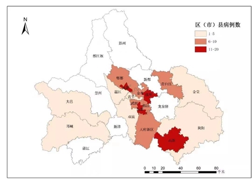 为加强社区防控,常住病例按照现住址,外地来蓉病例按照暂住地址划分,确诊病例分布于15个区(市)县:天府新区6例、高新区18例、锦江区9例、青羊区5例、金牛区8例、武侯区9例、成华区14例、青白江区7例、温江区3例、双流区3例、郫都区6例、简阳市2例、邛崃市5例、金堂县1例、大邑县3例、其他3例(指由机场、车站直接送往医疗机构的)。