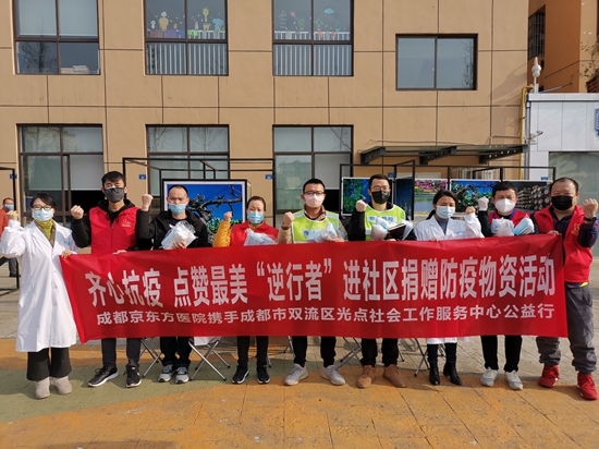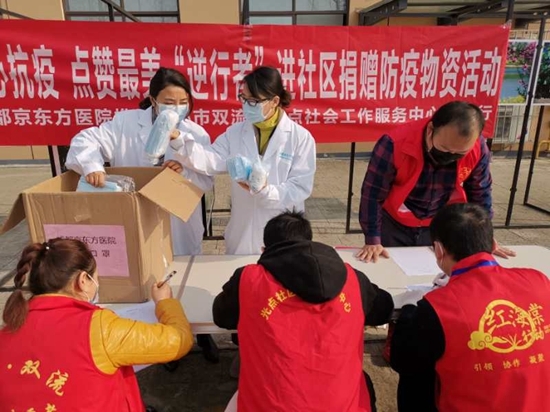 四川在线消息(记者丁宁摄影报道)“来,拿好口罩,你们辛苦了!保重身体,共同抗疫!”2月10日上午,在双流区黄甲街道一里坡社区党群服务中心前,正在举行“齐心抗疫点赞最美‘逆行者’进社区捐赠防疫物资活动”。据悉,此次活动由成都市双流区光点社会工作服务中心携手成都京东方医院共同举办,为双流区黄甲街道、怡心街道、黄龙溪镇等镇街的社区(村)一线工作人员捐赠医用口罩1500个。