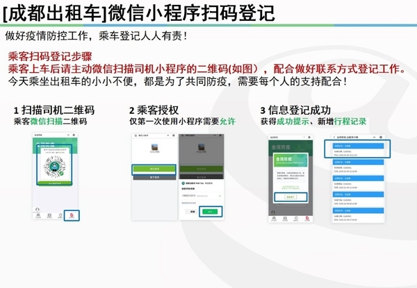 据悉,登记依托微信小程序。乘客乘车时,车载GPS语音系统自动播报:“尊敬的乘客,为做好疫情防控工作,落实疫情追溯要求,经您同意后,请配合扫描驾驶员手机微信小程序二维码登记信息,我们将依法严格保护您的个人隐私和个人信息安全,感谢您的理解和支持!”经乘客同意后,驾驶员向乘客出示“成都出租车”微信小程序司机端二维码,乘客使用微信扫一扫功能完成。