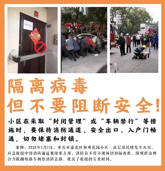 一是隔离病毒,但不要阻断安全。小区在采取“封闭管理”或“车辆禁行”等措施时,要保持消防通道、安全出口、入户门畅通,切勿堵塞和封锁。