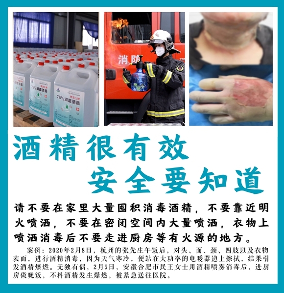 二是酒精很有效,安全要知道。居家隔离时,不要在家里大量囤积消毒酒精,不要靠近明火喷洒,不要在密闭空间内大量喷洒,衣物上喷洒消毒后不要走进厨房等有火源的地方。酒精着火,可以用灭火器扑灭,小面积着火也可用湿毛巾、湿衣物覆盖灭火。如在室外燃烧,可以使用沙土覆盖。